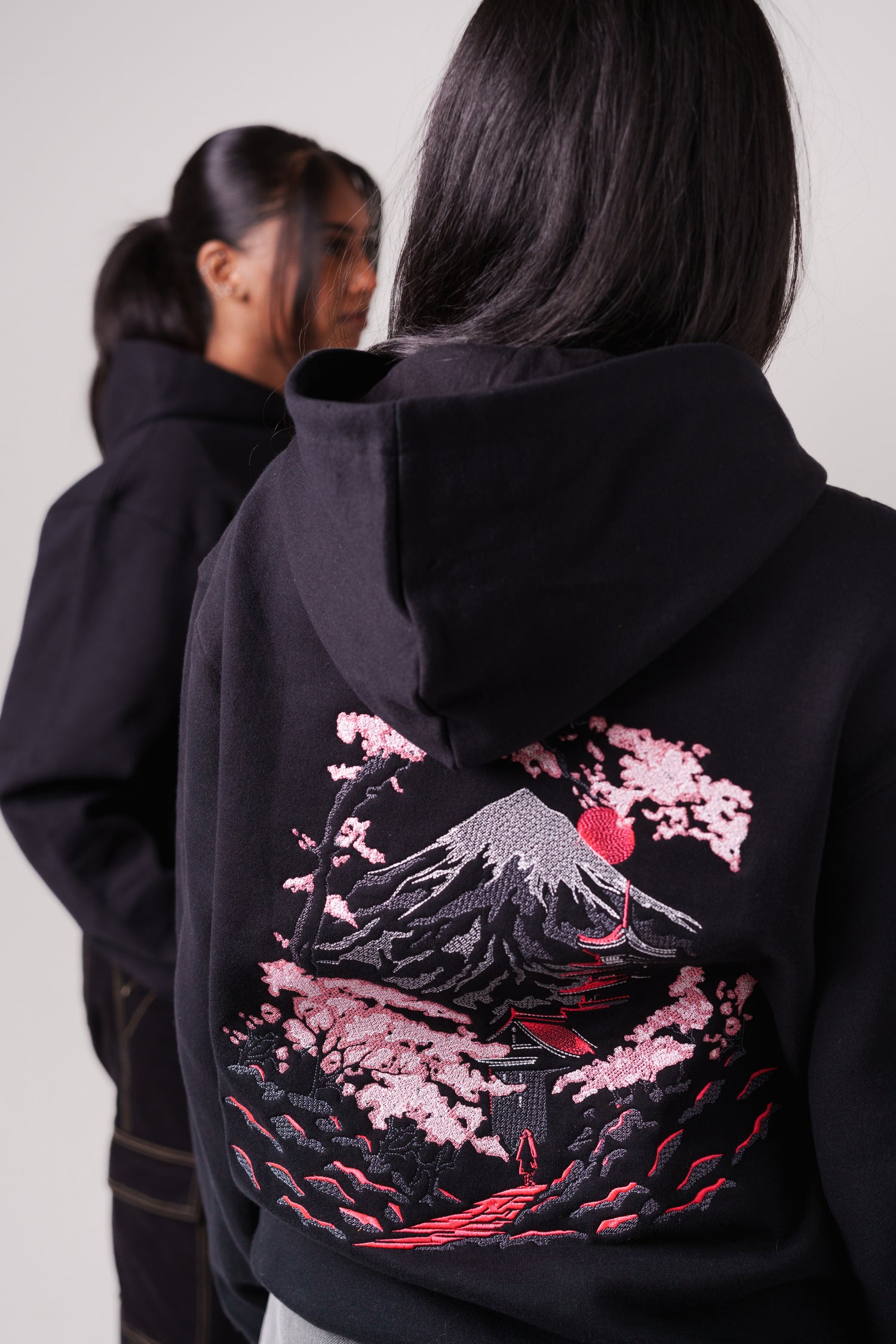 Inspired by the famous landscape of Mount Fuji in Japan, this hoodie has very intricate embroidery but also bounces off the colour of the black material to give a lot contrast to the artwork.